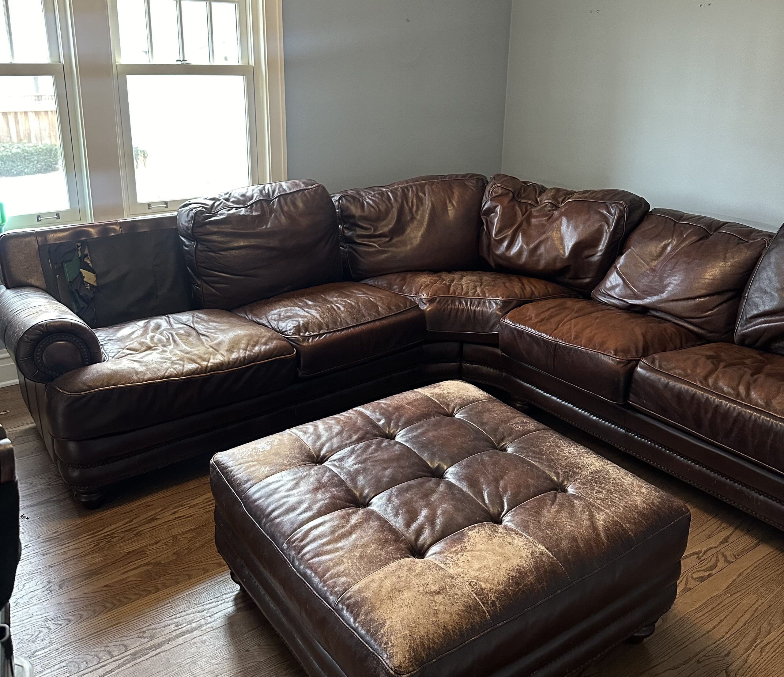 Worn leather couch with damage